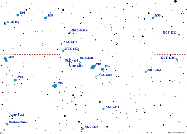 For larger scopes, the downtown region is like a treasure chest full of galaxies. The chart below shows all of the galaxies brighter than 12th magnitude within a 4o x 5o region surrounding M86.