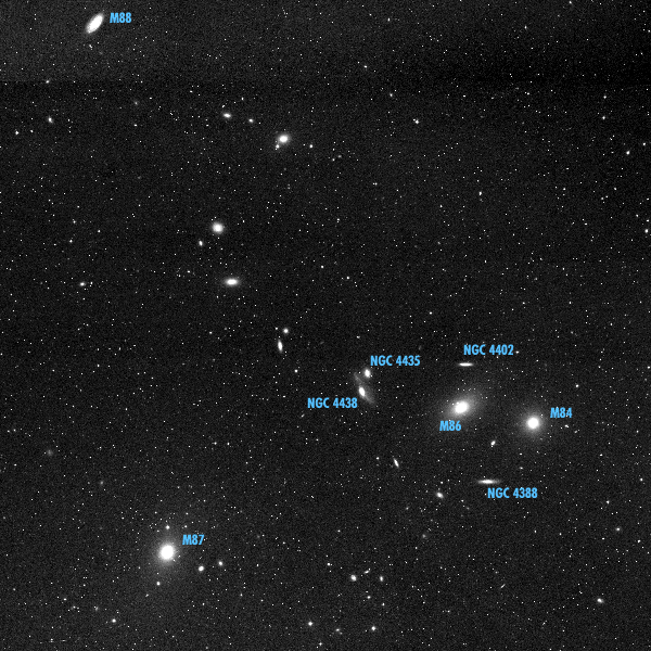 Within a 5o radius of M86 lie at least 40 galaxies brighter than 12th magnitude, making this area a rich hunting ground for even the smallest of telescopes. From a dark site a 6-inch scope will show about 140 galaxies in this region and an 18-inch scope will reveal over 600!