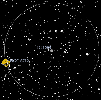 IC 1295 is typically cataloged as much fainter than it appears (sometimes as faint as 15th magnitude). It also responds strongly to the OIII and UHC filters. With one of these filters in place this little-known planetary appears as bright, or brighter than, the nearby globular! I think this planetary is a real show stopper. Its relative obscurity is probably due to the oft-reported erroneous integrated magnitude combined with the need of a UHC or OIII filter for it to really strut its stuff. The image above doesn't really do the planetary justice because it is a very blue object, which didn't record well on this red second-generation DSS image. Unfortunately, the blue DSS images are not yet widely available. In my 18-inch f/4.5 Dob, IC 1295 appeared large (similar in size to the globular with the OIII in place) quite obvious, and round. A small hole could be seen at the center, making it an annulus, but with very unusual proportions. The outer edges of the nebula appeared well defined (sharp) and somewhat irregular. When I removed the OIII filter the nebula all but disappeared, becoming much fainter and looking very different. Without the filter it appeared as a much smaller (perhaps half as large) diffuse glow, brighter near the center. It looked rather like a very diffuse elliptical galaxy but with an irregular, soft edge. In smaller scopes this nebula should appear as a small round patch. If you do not see it, be sure to use enough magnification (> 120x). Keep in mind that it can be a challenge without a filter. With the filter in place it should be visible in 6-inch scopes, if not smaller.