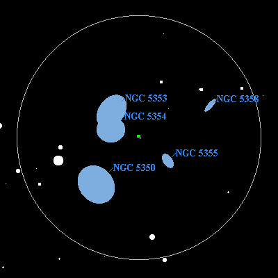 The view in a 6" at 135x. N is down, E is right. In 10" or larger scopes the much fainter NGC 5355 and 5358 appear, completing the quintet and the close NGC 5353/5354 galaxies make a very nice pair at high magnification. This group is a joy in my 18-inch f/4.5! NGC 5353/54 make a pretty pair and NGC 5350 appears large and smooth. My best view was at at 260x.