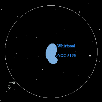 In 6-inch or smaller scopes M51 appears as a large, round, hazy spot with a large, slightly brighter center. A much smaller hazy spot lies nearby, nearly touching. This is the companion galaxy, NGC 5195. Larger aperture telescopes (> 8") will reveal the famous winding spiral arms and connecting bar between the two galaxies on excellent, dark nights. One night in March 2000 I observed M51 in my 18-inch Dob when the sky was very dark. The contrast was excellent and the galaxy beared magnification well. In my 4.8mm Nagler (430x) the main galaxy filled the field of view. The arms were obvious, offset by distinct dark regions between them that were so wide you could drive the proverbial truck through!