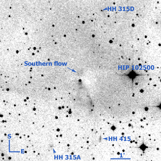 the Herbig-Haro object lies the variable Herbig AbBe pre-main