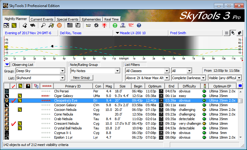 SkyTools Nightly Planner is set up above for November 24, at Del Rio Texas,