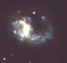 This galaxy appeared large and obvious at 82x. On the south side I could see a tiny smudge, elongated in the east/west direction. A faint, round halo could be glimpsed with averted vision. My best view came at 165x. The appearance was very strange because the bright smudge does not lie at the center of the halo. To the northeast lay a star, which is just at the edge of the halo. I saw no sign of NGC 4027A on this night.The strange appearance of NGC 4027 is likely due to gravitational interaction with at least one nearby galaxy, NGC 4027A in particular. The one bright spiral arm shines with the light of bright, blue stars, indicating a recent episode of star birth. Star formation always seems to accompany this sort of interaction, as the gas clouds collide to produce stars. NGC 4027A is also very distorted, showing signs of tidal stripping; a stream of gas seems to have been ripped away from it. Both these galaxies lie some 70 million light years distant.![]()