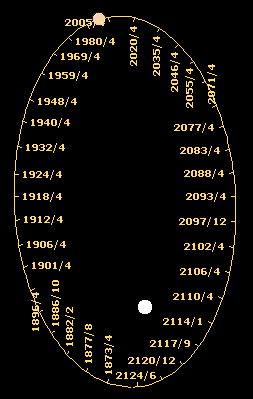 The orbital period of the B-C system is 260 years. The two stars are currently near their maximum separation. They will begin to close early in the next century, reaching minimum separation in the early 2100's. The diagram below shows the relative positions of the stars from the 1870's to the 2130's.