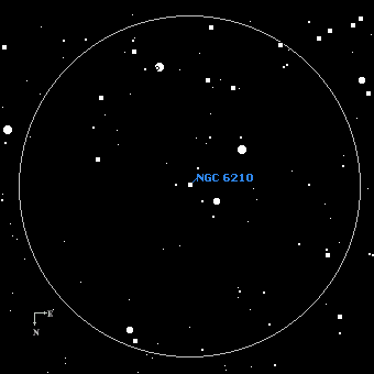 8 inches NGC 6210 appears as a small, round, blue-green disk. Larger instruments