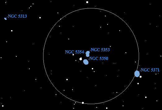 The 68th entry of Paul Hickson's catalog of compact galaxy groups sports a quintet of galaxies within 10o of the famous Whirlpool galaxy. At least a 10" scope is required to see all five members. A 6" will show the three brightest, NGC 5353, 5354, and 5350, as well as the nearby NGC 5371 and 5313. In a 6" the view of NGC 5353 and 5354 is dominated primarily by their bright cores. NGC 5350 is considerably larger and more diffuse; it may require averted vision. The presence of a nearby 6th magnitude star may make this galaxy difficult. Use high magnification--at least 130x. I noted in my log that the nearby star is actually a nice pair at low power. The nearby NGC 5371 is even larger and much more diffuse and may also require averted vision to see.