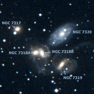 The largest and brightest galaxy is NGC 7320. It is just visible in a six-inch scope as an elongated hazy patch. Larger instruments may show mottling in the outer parts. This galaxy has a much lower redshift and is likely to be between us and the other members of the quintet. You will need at least an 8-10" scope and dark skies to see the other galaxies of this group, which are apparently part of the same galaxy cluster. At 100x they appear as a close grouping. Use higher magnifications to study the individual galaxies. A few arc minutes to the northwest of NGC 7320 you will see two apparently interacting members (NGC 7318A and NGC 7318B). Taken together they appear nearly as large as NGC 7320 at the eyepiece. Look for their bright cores and a hint of a spiral arm just to the east of the center of NGC 7318B. To the northeast of this pair lies NGC 7319, a face-on barred spiral. Look for a hint of spiral structure on the outer northeastern edge. The final member, NGC 7317, lies to the southwest of the NGC 7318 pair, and is a typical featureless elliptical galaxy. While you