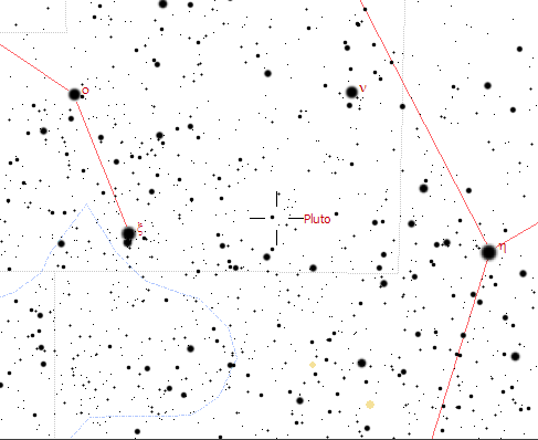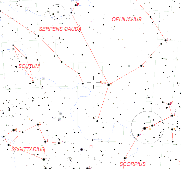 The above chart shows the location of Pluto in Ophiuchus. North is up, east is to the left.