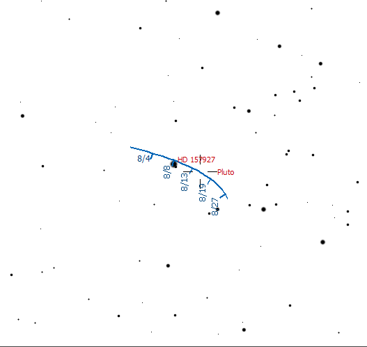 Finally, the above chart shows the path of Pluto during August. The width of the chart is ~1o. The faintest stars are magnitude 14. North is up and east is to the left. The nearby star HD 157927 is magnitude 8.3.