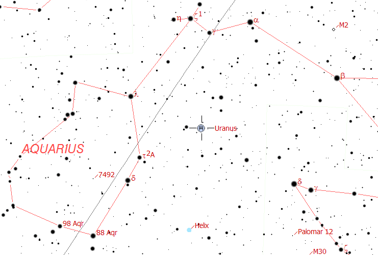 The above chart shows approximately a 10o region. The faintest stars are magnitude 11. North is up, east is left. The line indicates the motion of Uranus throughout the month, starting on September 1 on the upper left.