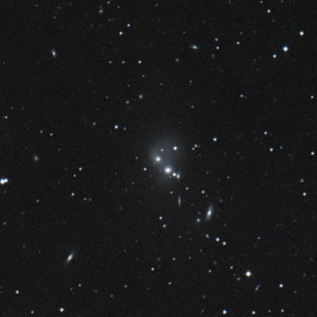 Hickson 94 is a compact galaxy group with a total of seven members. Measurements of the gas temperature between the galaxies and the unabsorbed X-ray luminosity indicate that this is a true galaxy cluster. The redshift (Z) of the member galaxies is 0.04, representing a light travel time of 600 million years from the cluster to your eye. The cluster was apparently discovered by William Herschel, who merely noted, "4 or 5 small stars with nebulosity."