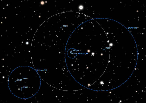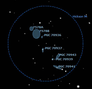 Nearby lie two other galaxies within reach of larger amateur instruments. PGC 70943 is a 16.2 magnitude spiral galaxy that subtends 28" x 13". Despite the faint magnitude, the surface brightness of this galaxy is relatively high (22.3 mag/arc-sec2). This galaxy is listed as interacting with an associated bar. As with the others the core of PGC 70943 is most easily seen and appears stellar. PGC 70936 is a tiny (10" x 6") 16.3 magnitude lenticular galaxy that lies very close to the NGC 7578A/B pair. This tiny galaxy appears in the eyepiece as a very faint star. Unfortunately, a nearby star is easily confused with it (see image).